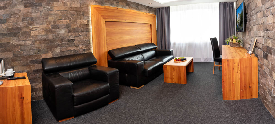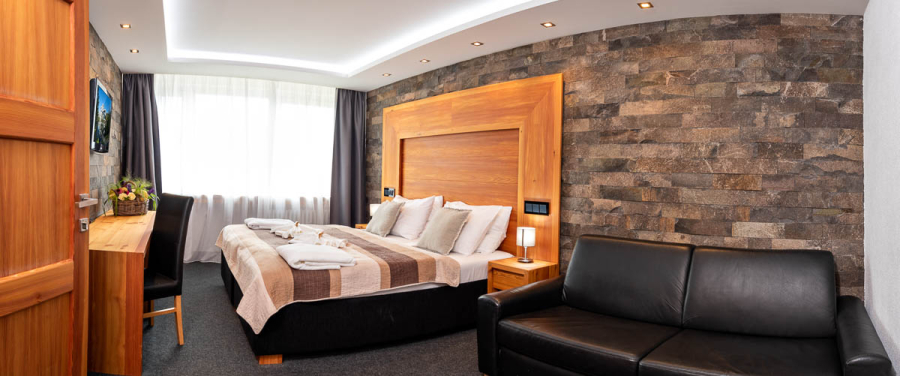 Suite Premium Kriváň je elegantný apartmán, ktorý je ladený v príjemnej kombinácii dreva a kameňa a ponúka maximálny komfort. Použité prírodné materiály (drevo z masívu, kameň a koža) sú kvalitne spracované a vytvárajú tak štýlový interiér. V spálňovej časti je manželská posteľ a samostatná prístelka, gauč v obývacej časti je možné pripraviť ako prístelku. Apartmán je vhodný pre rodiny s deťmi. Samostatná kúpeľňa je so sprchovacím kútom, vaňou a toaletou. Z apartmánu, ktorého obývacia časť má balkón, máte výhľad na Kriváň.